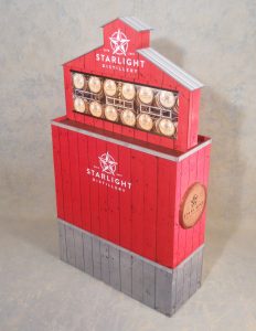 When it comes to capturing brand essence at retail, Starlight Distillery took things to the next level with a custom display designed to feel like home—a classic red barn. This custom wood display doesn’t just hold bottles; it tells a story. Built to mimic the traditional aesthetic of the brand’s origins, the display prominently features Starlight Distillery’s branding on the façade, evoking the rustic charm and authenticity of a real countryside barn.
